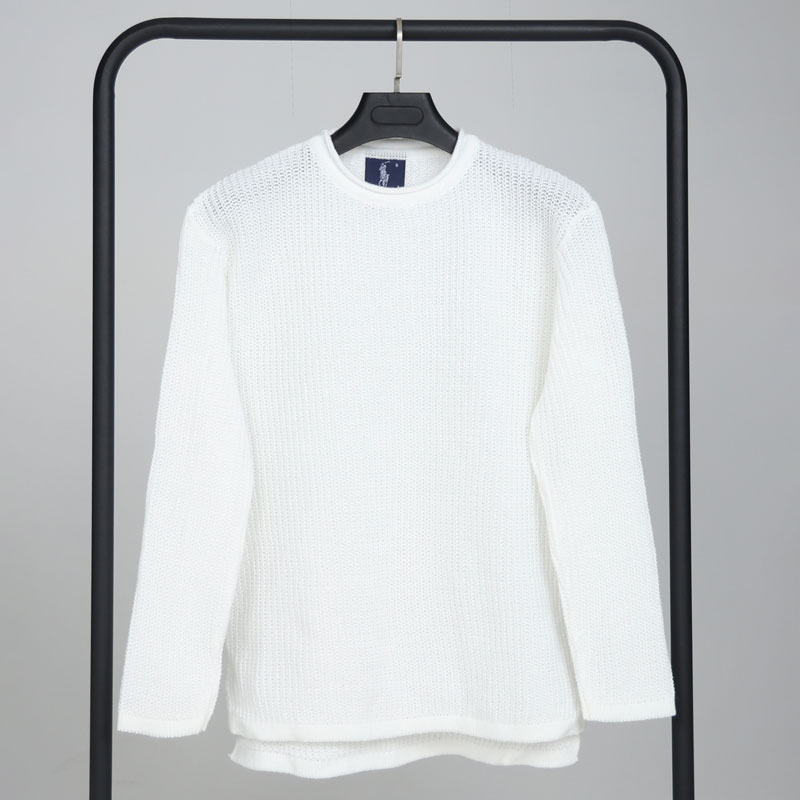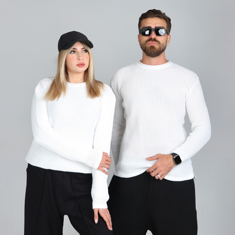 این بافت یقهگرد مردانه و زنانه را میتوان با شلوار سفید، مشکی یا جین ست کرد. ترکیب آن با کفش اسپرت یا بوت با رنگهای خنثی ظاهر مدرن و مینیمال ایجاد میکند. مناسب برای عکاسی مدلینگ، استایل خیابانی و استفاده روزمره.