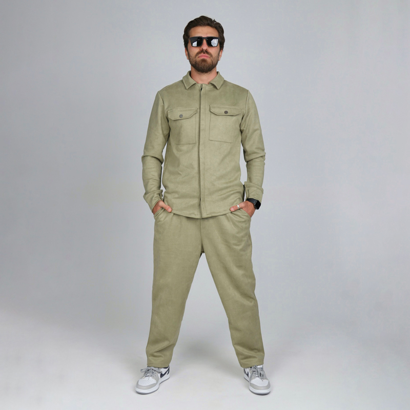 رنگ سبز روشن این ست مردانه باعث میشود از سایر استایلها متمایز شوید و جلوهای خاص و آرامشبخش به پوشش شما بدهد. این رنگ با کفشهای سفید، طوسی یا کرم ترکیب بسیار شیکی ایجاد میکند و برای روزهای پاییزی، حس طراوت و گرما را به همراه دارد.