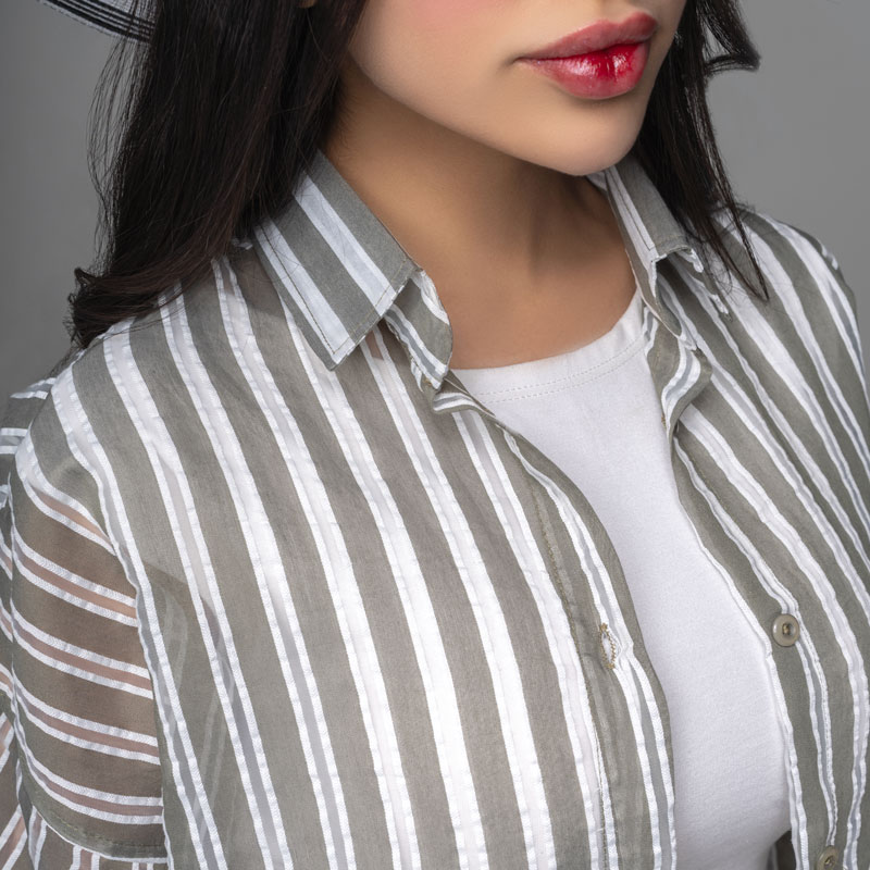 پارچه استفادهشده در شومیز شیشه ای زنانه مدل پری راه راه کد SHOM07، شیشه ای ،نازک، سبک و خنک است. این ویژگی آن را به گزینهای عالی برای استفاده در فصلهای بهار و تابستان تبدیل کرده است.