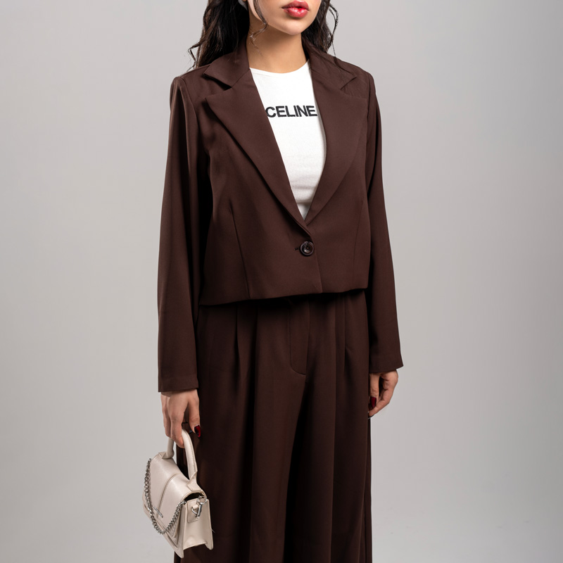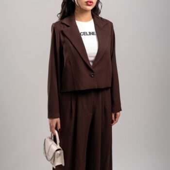 طراحی این کت و شلوار زنانه مدل بگ استایل رنگ قهوه ای شکلاتی کاملاً مطابق ترندهای روز انجام شده است. ترکیب کت کوتاه با شلوار بگ دمپا گشاد، باعث ایجاد تعادل در فرم اندام و کشیدهتر دیده شدن استایل میشود. رنگ قهوهای شکلاتی نیز حس لوکس، گرم و خاصپسند را به استایل شما اضافه میکند.