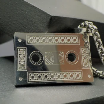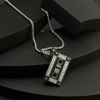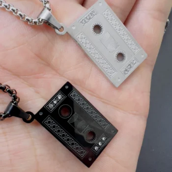 گردنبند طرح نوار کاست از جنس استیل رنگ ثابت میباشد و به هیچ وجه با اب رنگ کار تغییر نمی کند . گردنبند داری رنگبندی مشکی و نقره ای است .روی پلاک گردنبد طرح نوار کاست نگین های کوچیکی کار شده.که زیبایی خاصی به کار میدهد.